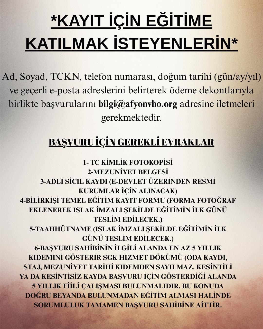 Ad, Soyad, TCKN, telefon numarası, doğum tarihi (gün/ay/yıl) ve geçerli e-posta adreslerini belirterek ödeme dekontlarıyla birlikte başvurularını bilgi@afyonvho.org adresine iletmeleri gerekmektedir.
